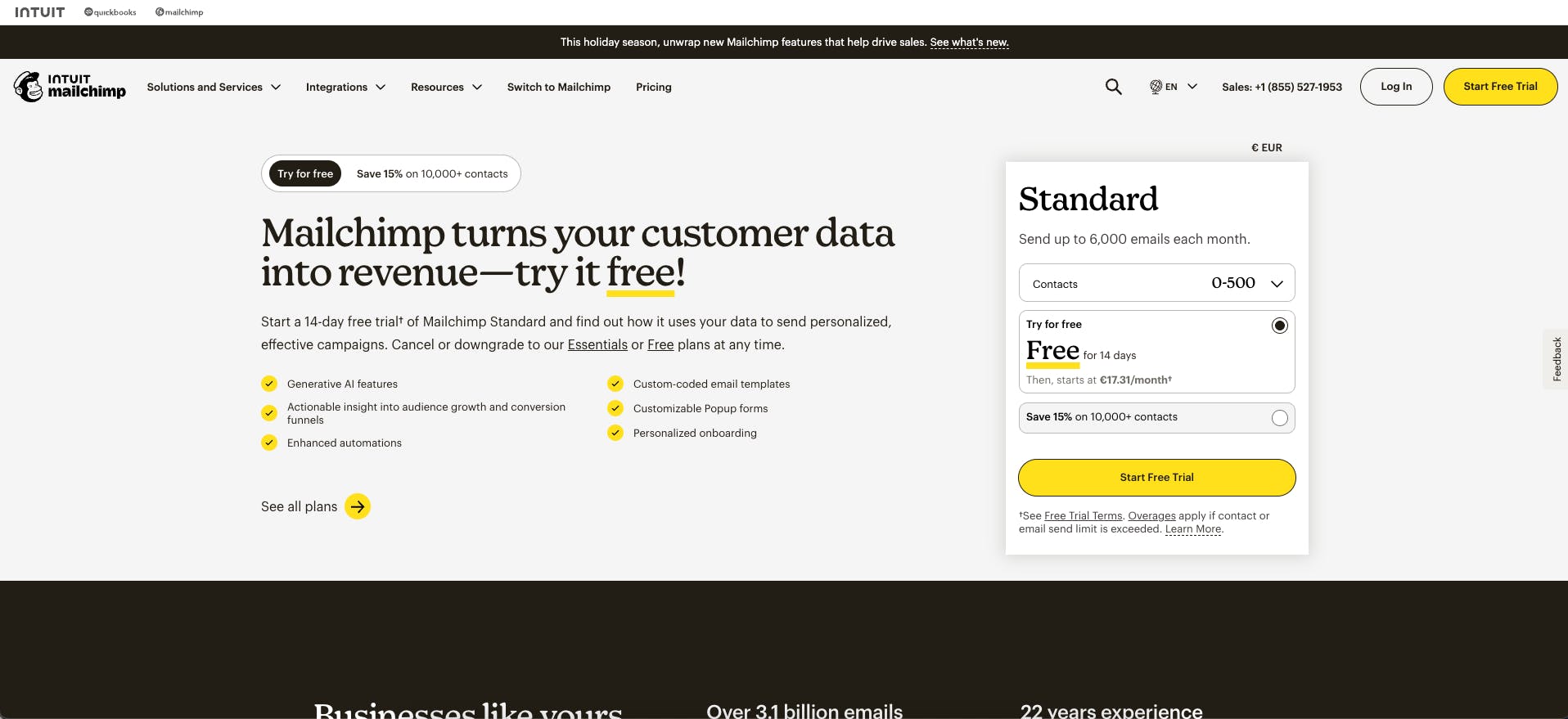 - Free plan: Up to 500 contacts, 1,000 sends/month