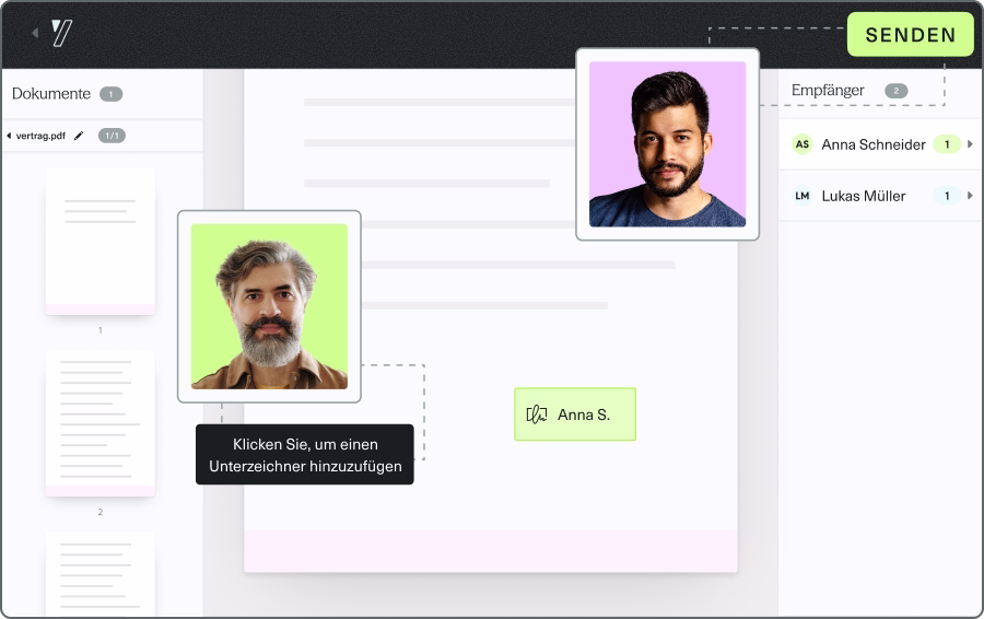 Laden Sie Ihre Dokumente hoch, geben Sie die Kontakte an und legen Sie die Reihenfolge fest, in der die unterzeichnenden Parteien um eine elektronische Signatur gebeten werden sollen.