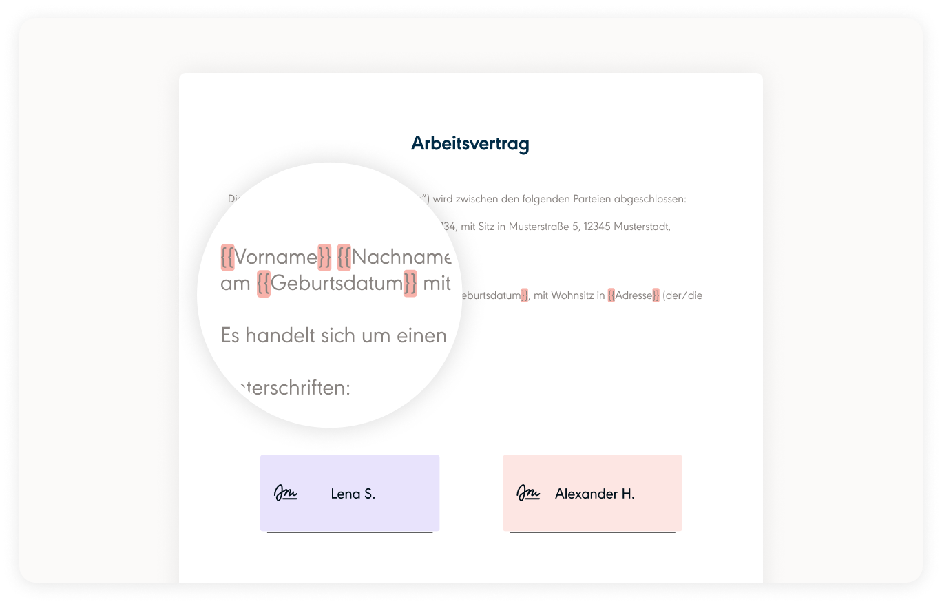 Bevor Sie Ihr Dokument in der Web-App hochladen, sollten Sie vor und nach den variablen Feldern {{ }} einfügen, um das Ausfüllen des Dokuments automatisieren zu können.