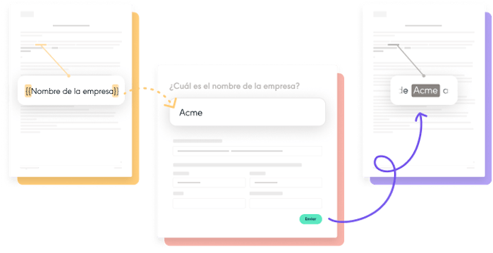 Sólo tienes que añadir {{ }} alrededor de los campos modificables del documento antes de integrarlo en la aplicación para que se cumplimente automáticamente.