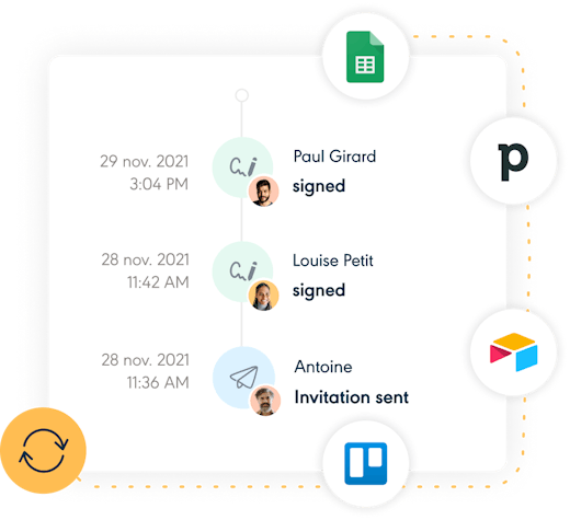 Crea fácilmente integraciones complejas entre tus herramientas y sin tener que codificar. Solo hace falta una cuenta Yousign y una cuenta Zapier para seguir instantáneamente la firma de tus documentos desde tus CRM, ERP, SIRH, herramientas de comunicación, etc.