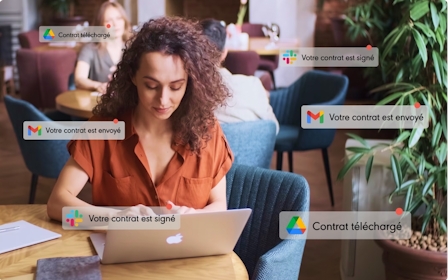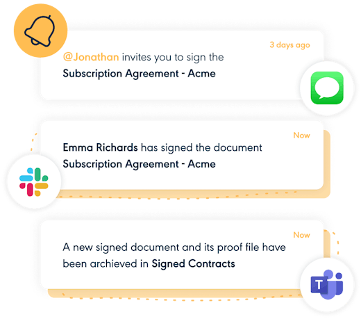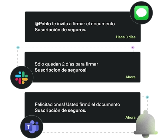 Envía o recibe una notificación en tiempo real en cada etapa importante (tu documento está firmado, un signatario ha terminado, etc.) a través de Slack, Gmail, Teams, Microsoft Outlook, etc.