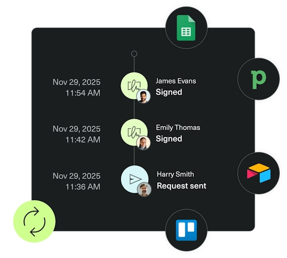 Your signature requests data is automatically updated in your tools, in real time, in Pipedrive, Hubspot, Salesforce, BambooHR, Greenhouse, Airtable, Trello, etc.
