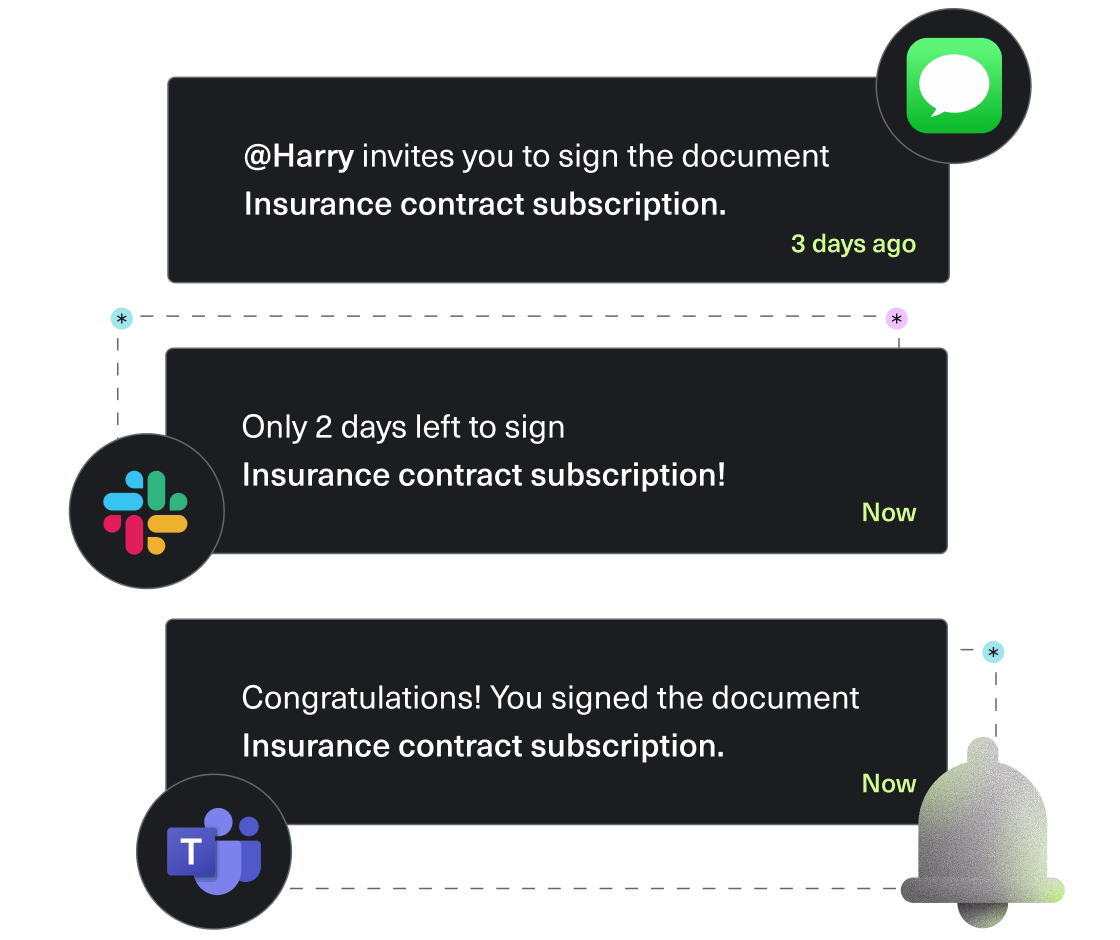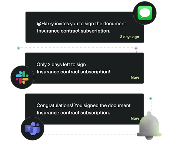 Send or receive real-time notifications for every important milestone (your document is signed, a signer has finished, etc.) with Slack, Gmail, Teams, Microsoft Outlook, etc.