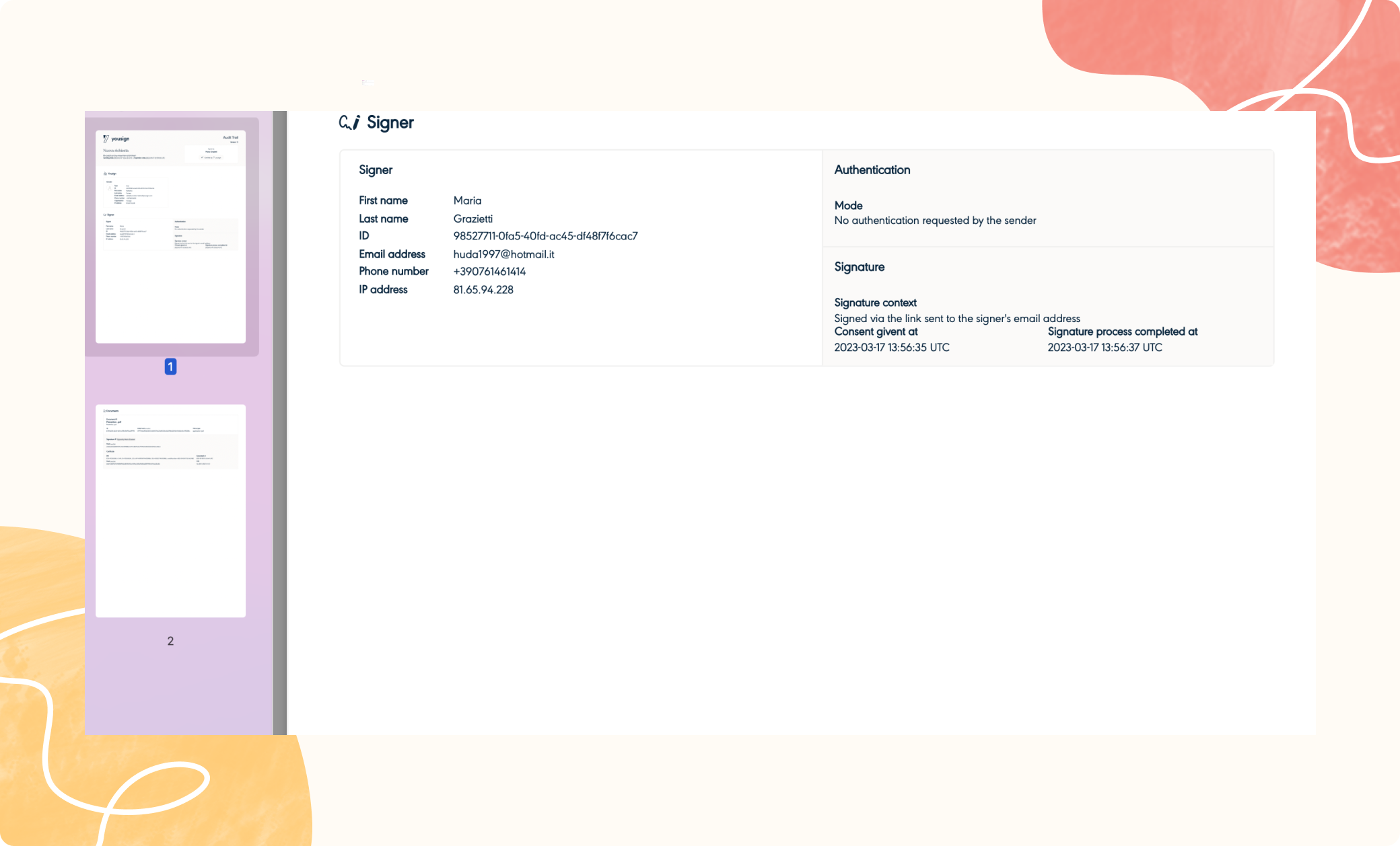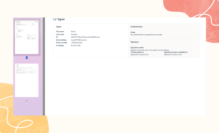 Genera e archivia un file PDF di prova legalmente riconosciuto per garantire ciascun contratto, completo di tutti i dettagli utili: data e ora della firma, identità del firmatario, modalità di autenticazione utilizzata (come OTP o firma elettronica avanzata) e integrità del documento firmato. Il tutto viene conservato in modo sicuro, conforme al regolamento eIDAS, per garantire validità legale e massima tracciabilità in caso di necessità.
