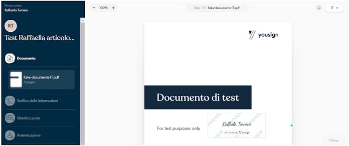 Yousign utilizza una soluzione di firma elettronica in formato PAdES con verifica dell’identità del firmatario tramite codice OTP (per la FES) o tramite OTP e verifica del documento d’identità (per la FEA).