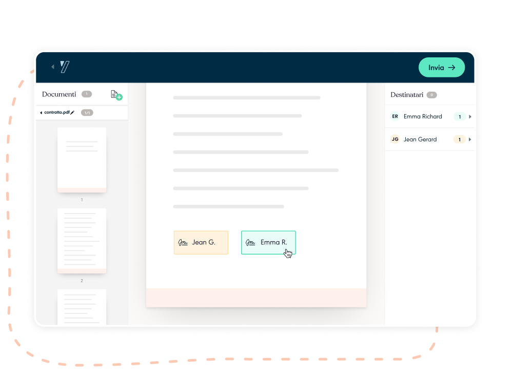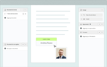 La firma elettronica è uno strumento per semplificare l'approvazione dei contratti e ottimizzare i processi decisionali. Per cominciare, seleziona le parti firmatarie, aggiungi il tuo contratto e inizia a firmare i tuoi documenti online. La firma elettronica dei documenti è semplice per il tuo team, facile per i tuoi partner e aiuta la tua azienda ad eliminare le scartoffie.