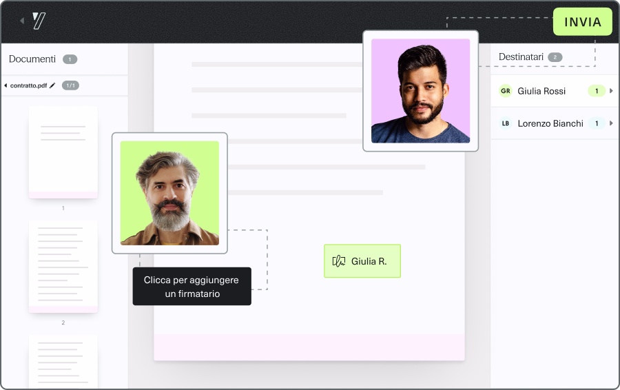 Carica i tuoi documenti, i contatti e imposta l'ordine in cui le parti firmatarie dovranno firmare elettronicamente.