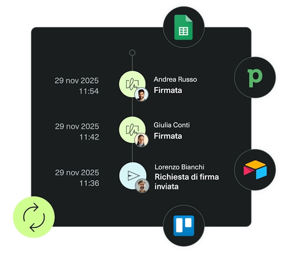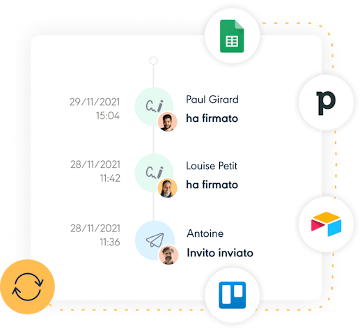 I dati dei tuoi inviti alla firma sono automaticamente aggiornati nei tuoi strumenti, in tempo reale, in Pipedrive, Hubspot, Salesforce, BambooHR, Greenhouse, Airtable, Trello, ecc.